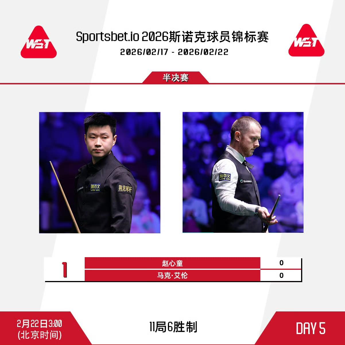 北京时间21点,上半区:约翰·希金斯 vs 贾德·特鲁姆普北京时间次日3点,下半区:赵心童 vs 马克·艾伦
